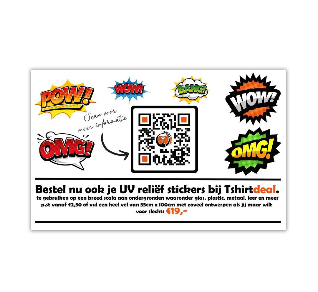 Entonces prueba primero nuestro set de muestra de pegatinas UV con relieve. Este juego incluye 7 stickers DTF UV que puedes aplicar tú mismo en distintos productos, para comprobar su aspecto real y adherencia sobre varias superficies. ¿Solo pides el set? Entonces pagas únicamente los gastos de envío. ¿También haces un pedido por metro? ¡Recibes el set totalmente gratis! En Tshirtdeal trabajamos con impresoras profesionales UV DTF, lo que nos permite imprimir tus pegatinas en alta calidad, con gran precisión en los detalles. Ya sea un logo, texto o imagen: todo se reproduce con nitidez. La capa de barniz incluida en la impresión crea un efecto en relieve muy atractivo y resistente. Estas pegatinas se adhieren bien a una amplia variedad de superficies.